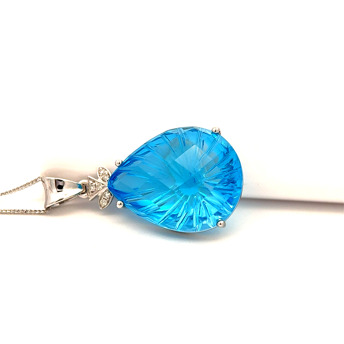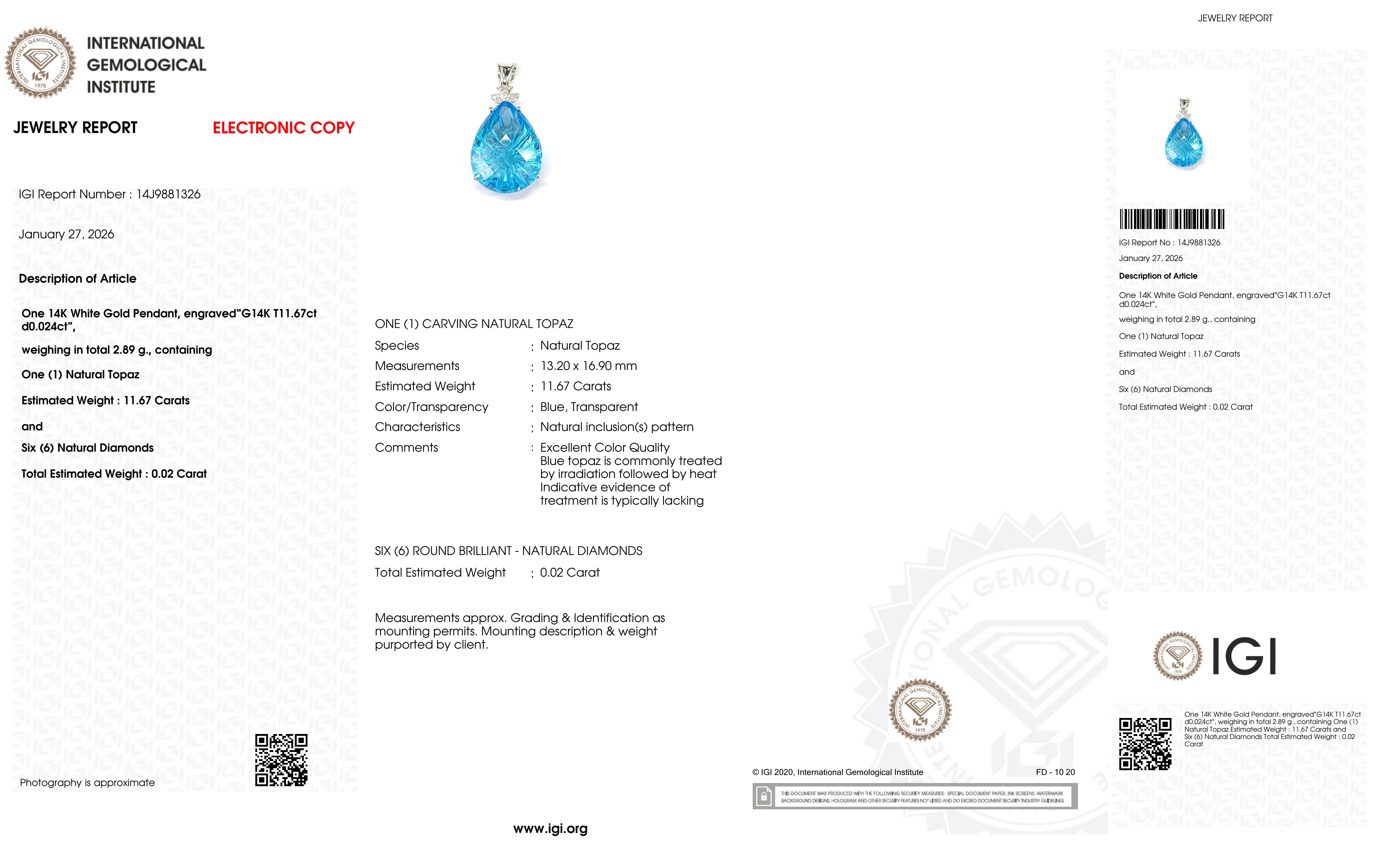 14K White Gold Pendant with 11.67 ct Natural Blue Topaz & Diamonds – IGI Certified