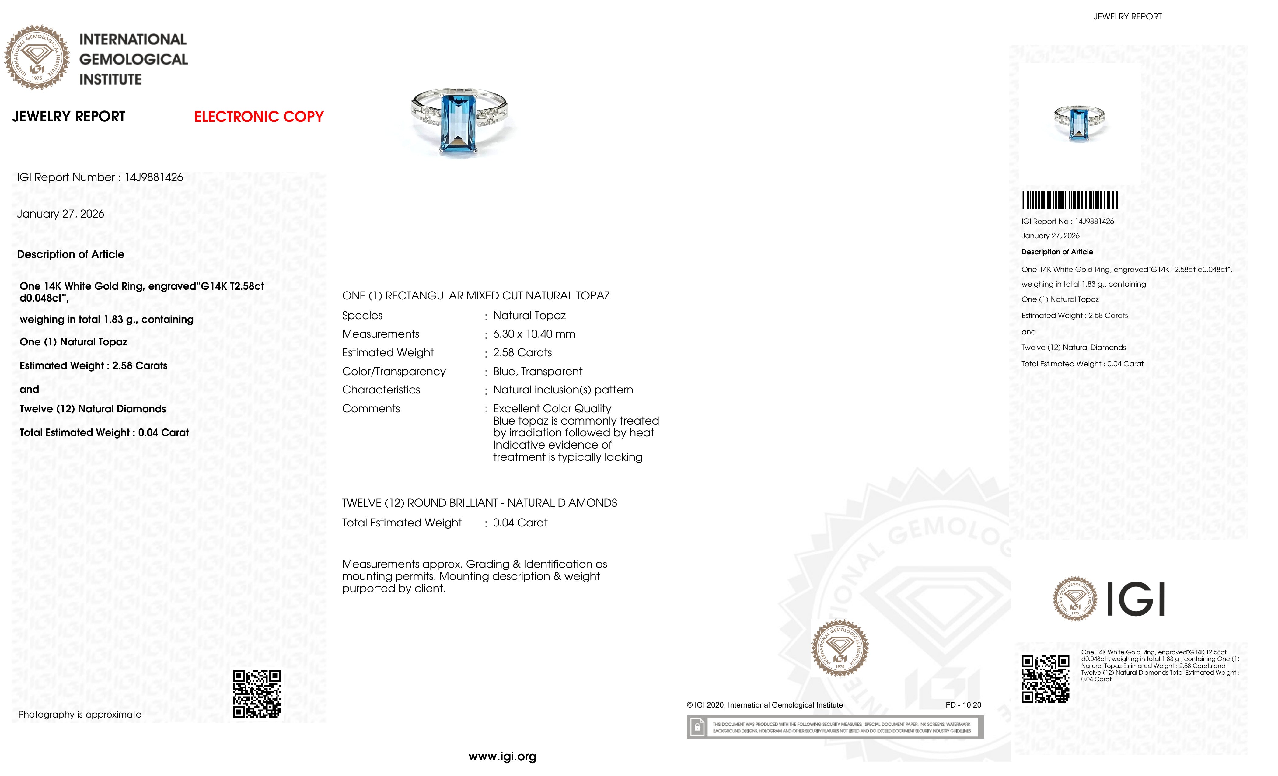 14K White Gold Ring with 2.58 ct Natural Blue Topaz & Diamonds – IGI Certified