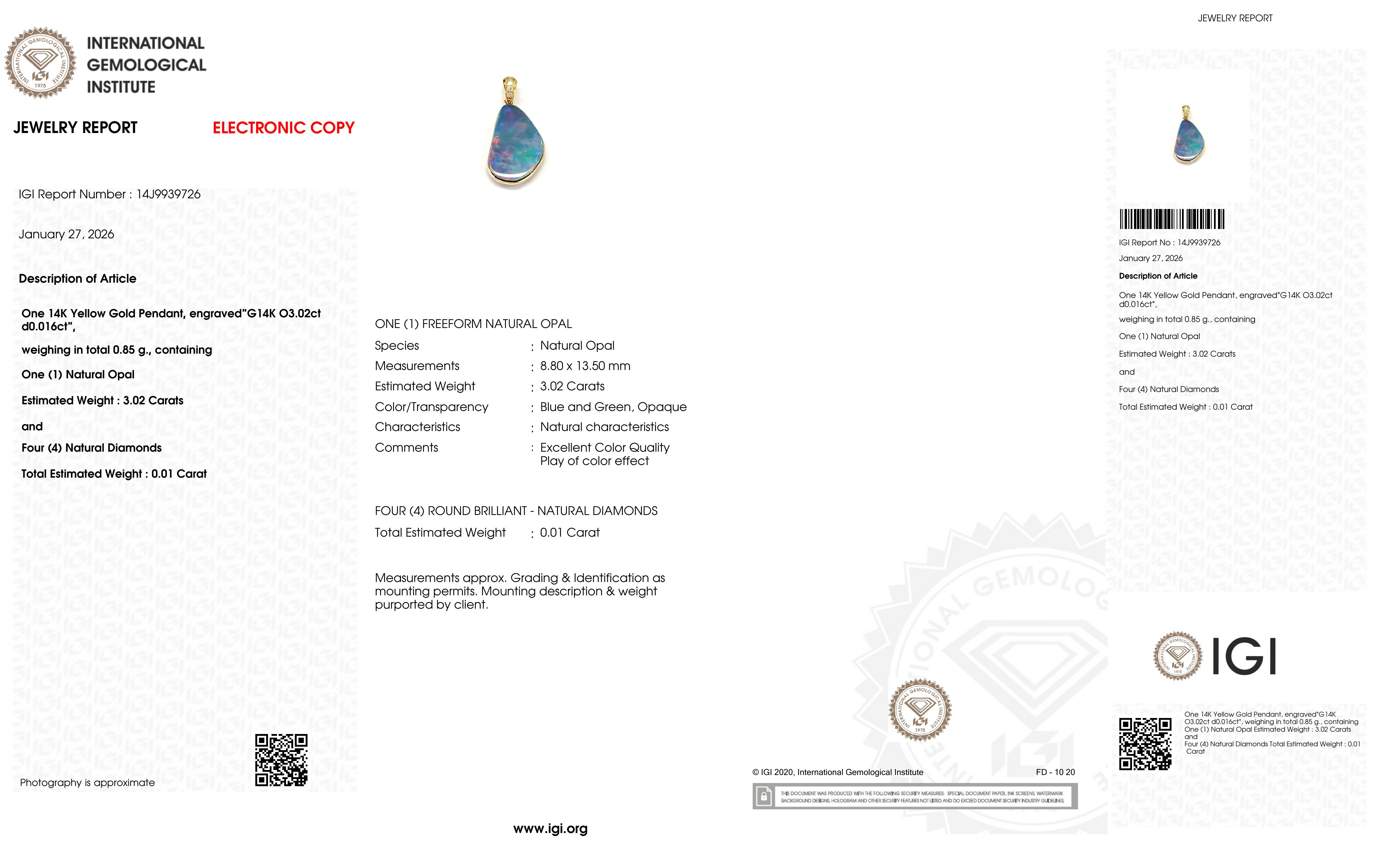 14K Yellow Gold Pendant with 3.02 ct Natural Opal & Diamonds – IGI Certified